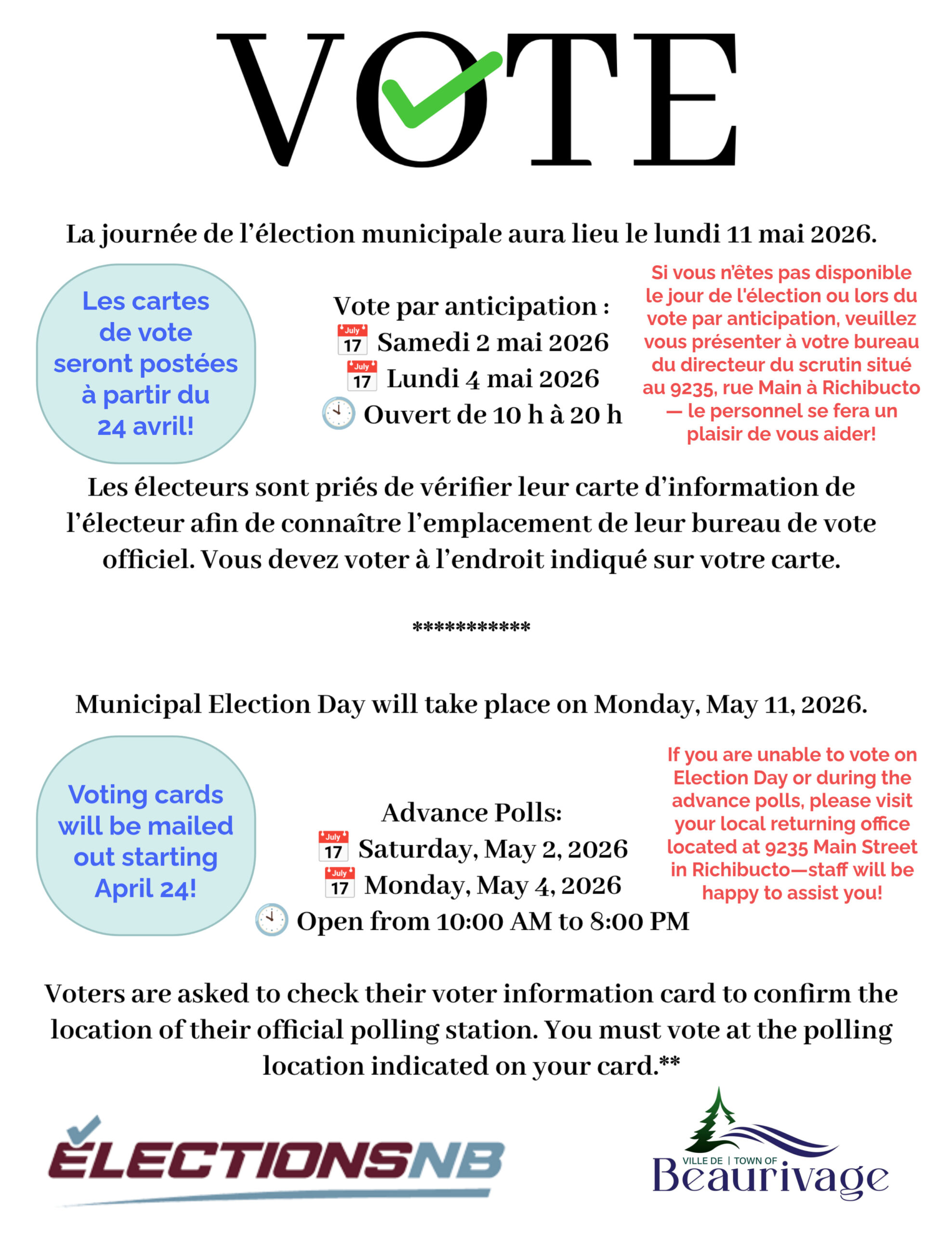 Special Meeting: Tuesday, Avril 28, 2026 – 5:30 p.m. Municipal office: 9235 Main st, Richibucto.
